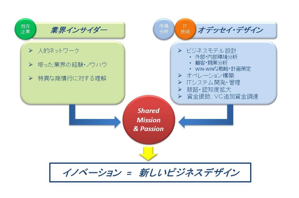 私たちは、変化しつつある市場に対して、最新のIT技術手法を活用して、いまの既存業界にない新たなデザインを組み立てることにチャレンジします。ビジネスモデルの持続、既存業界内の変革、社会への貢献の最適化を図り、新たなビジネスデザインを導き出していく予定です。利用者には共感されるサービスを提供し、関連当事者全てには便益を享受できるWin-Winなビジネスモデルを構築していきます。